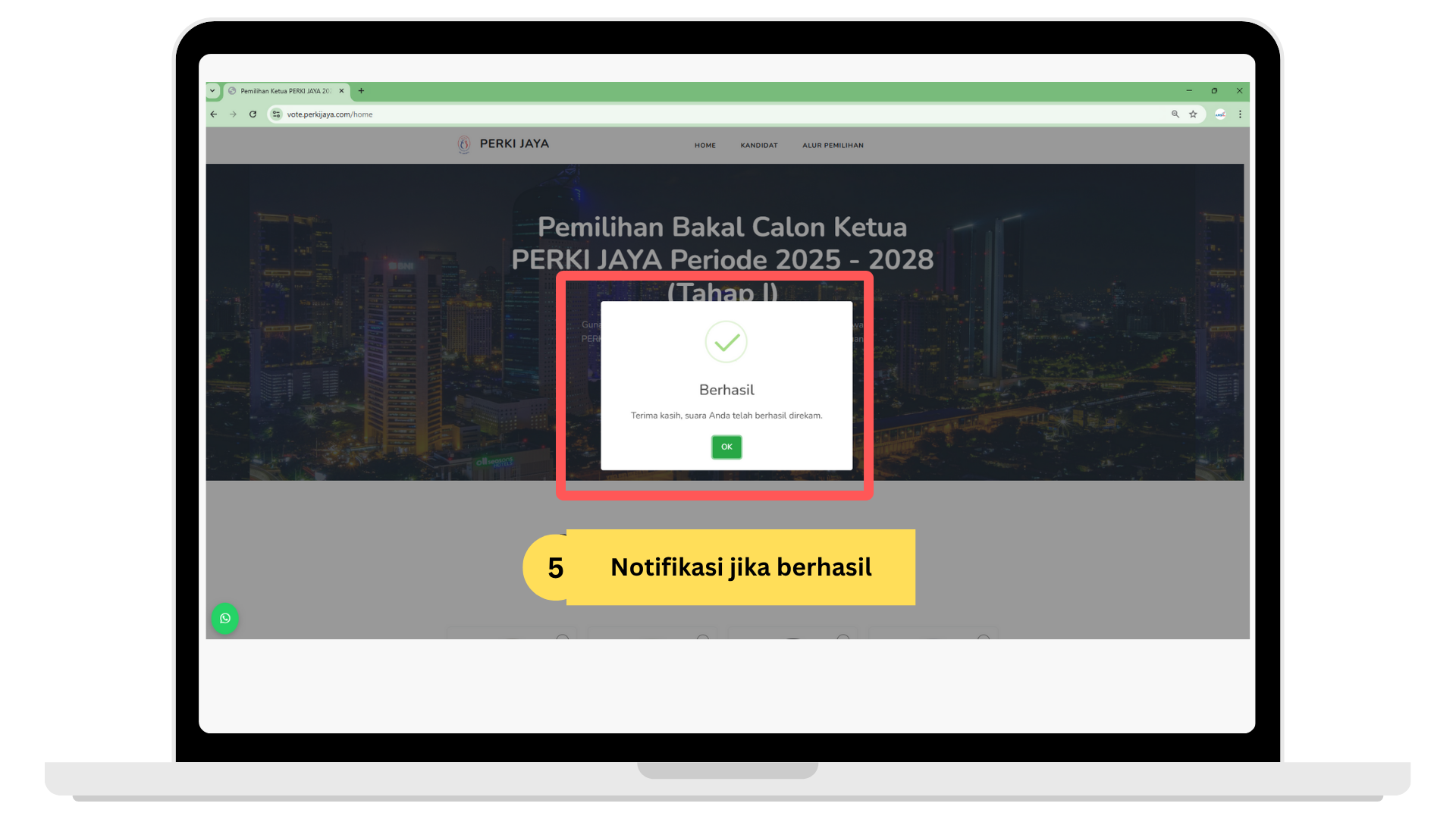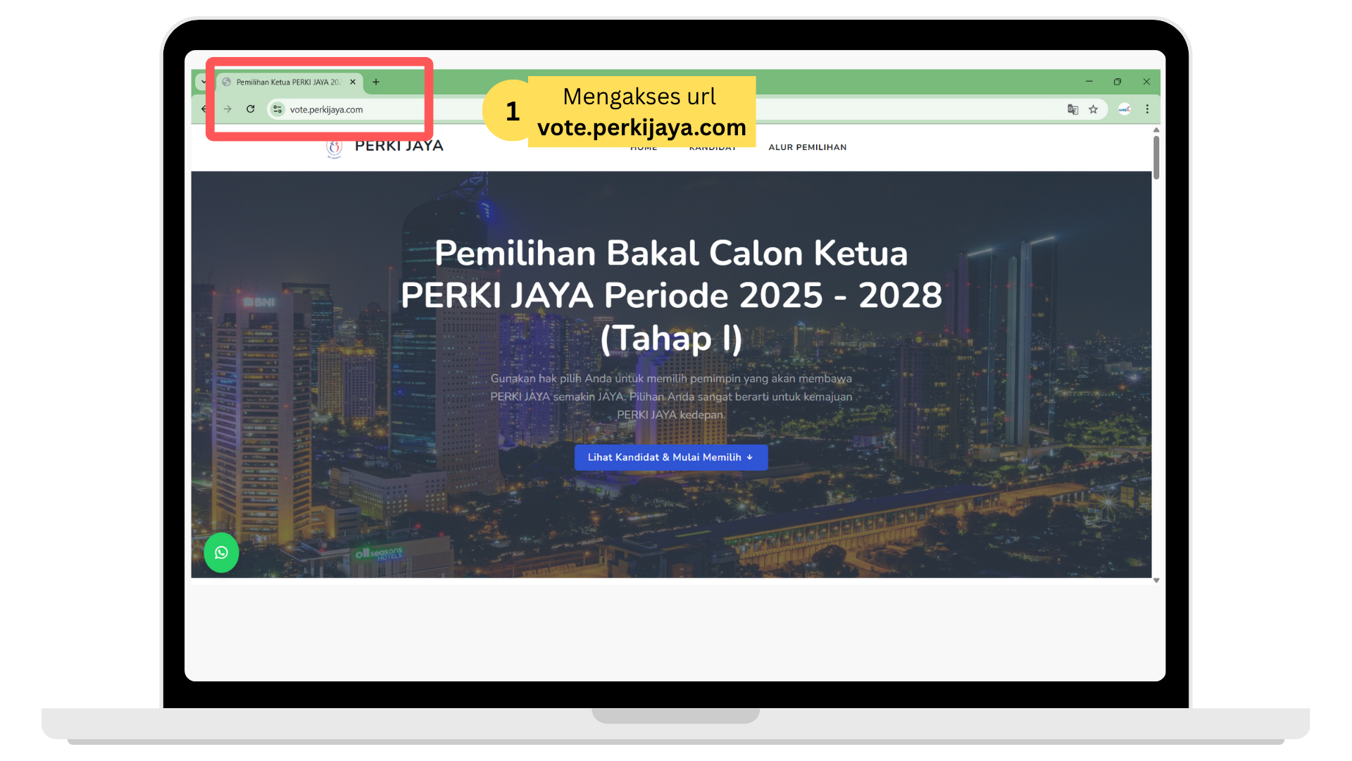Buka browser Anda dan kunjungi vote.perkijaya.com untuk memulai proses pemilihan.
