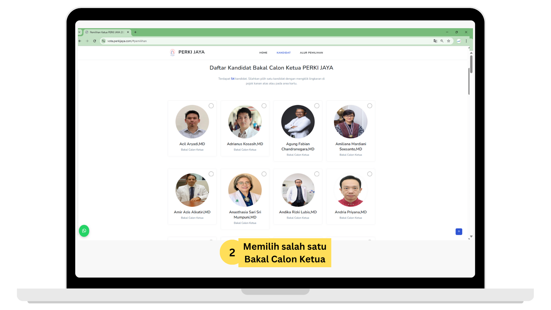 Telusuri daftar kandidat yang tersedia, lalu klik pada area foto untuk memilih satu bakal calon.