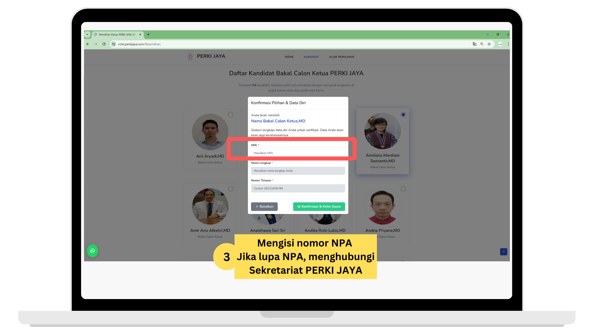 Masukkan NPA Anda. Setelah memastikan pilihan dan data yang diisi benar, klik tombol “Konfirmasi & Kirim Suara”. Jika Anda lupa NPA, silakan hubungi Sekretariat PERKI JAYA untuk bantuan.